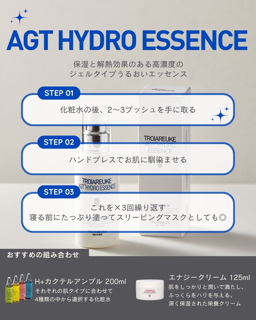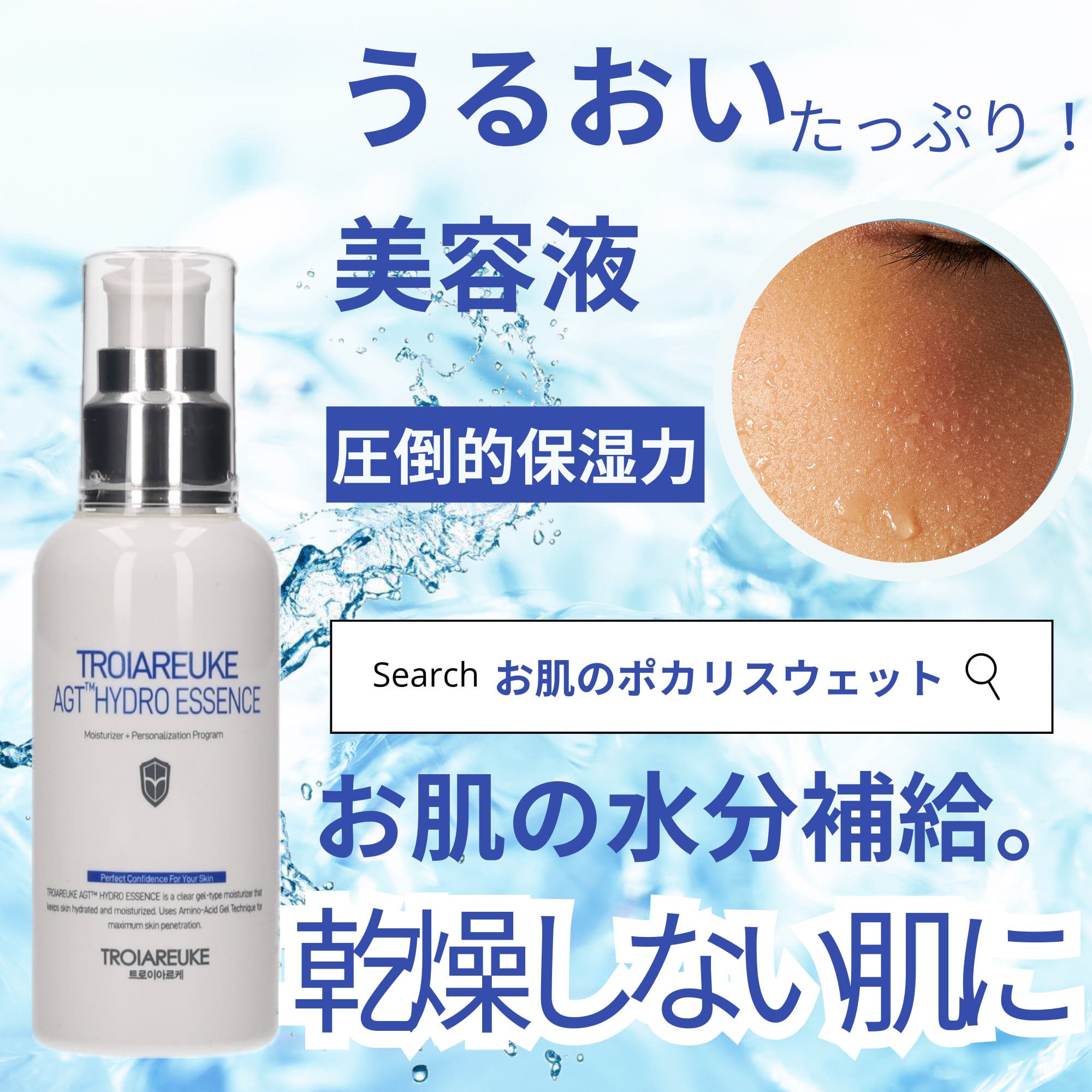 アミノ酸ジェルテクニック(A.G.T): 素早く深く浸透する保湿エッセンス。アミノ酸ベースの小分子が数秒で肌に瞬時に吸収され、肌の層に浸透して肌の深部組織に水分を届けます。